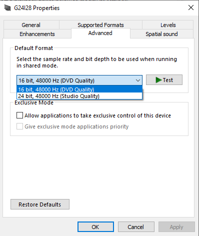 Thank you very much. Solution 6 solved my problem. I have to reduce the audio default format to 32 bit, 96000 Hz.