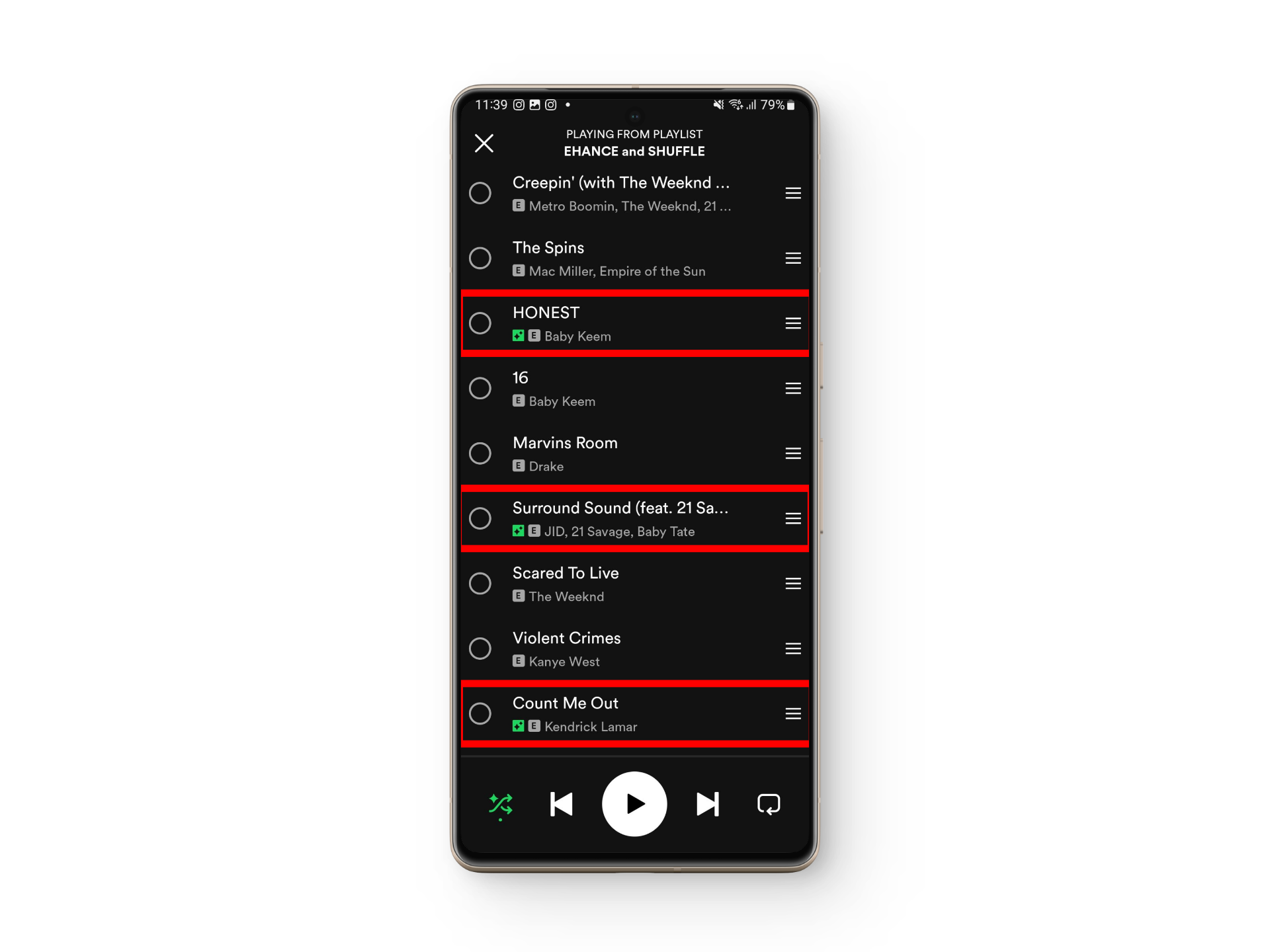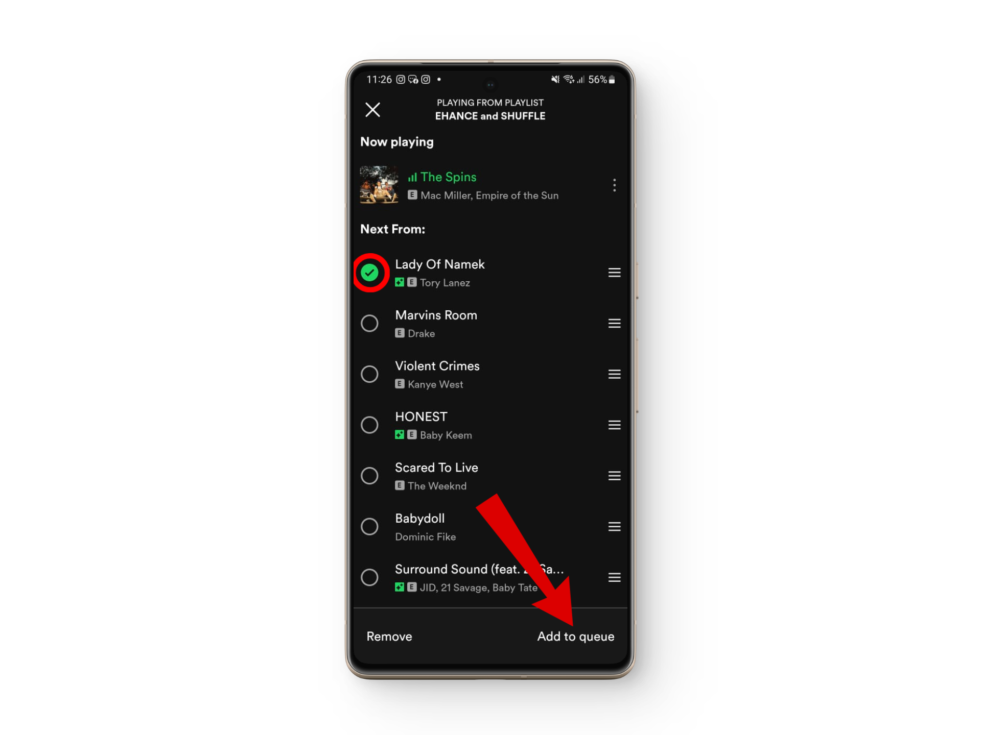 - Open your playlist’s music queue and identify the recommended songs.