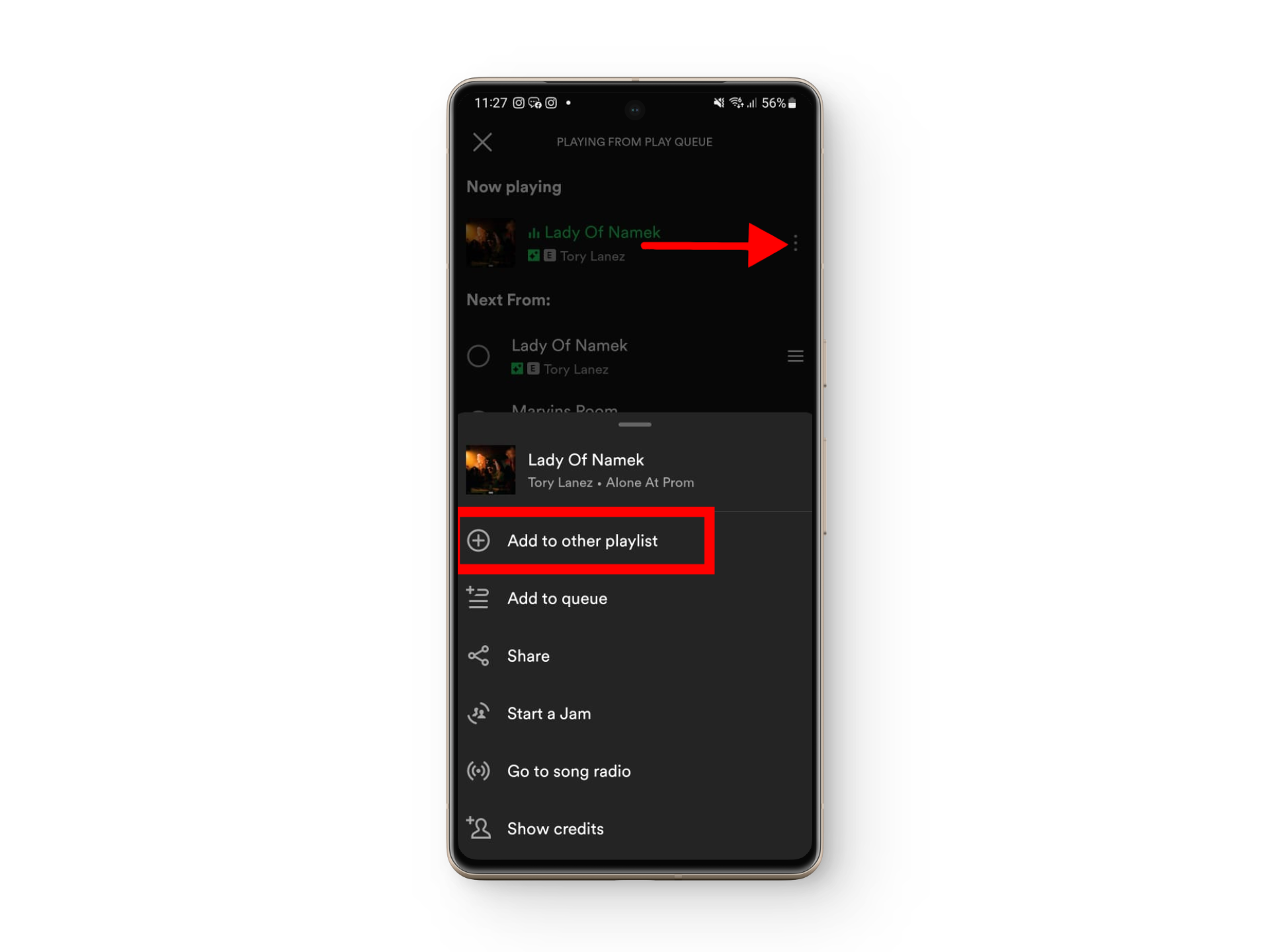 Add the song to your queue - When the song plays, tap the three vertical dots next to it, then select Add to other playlists.