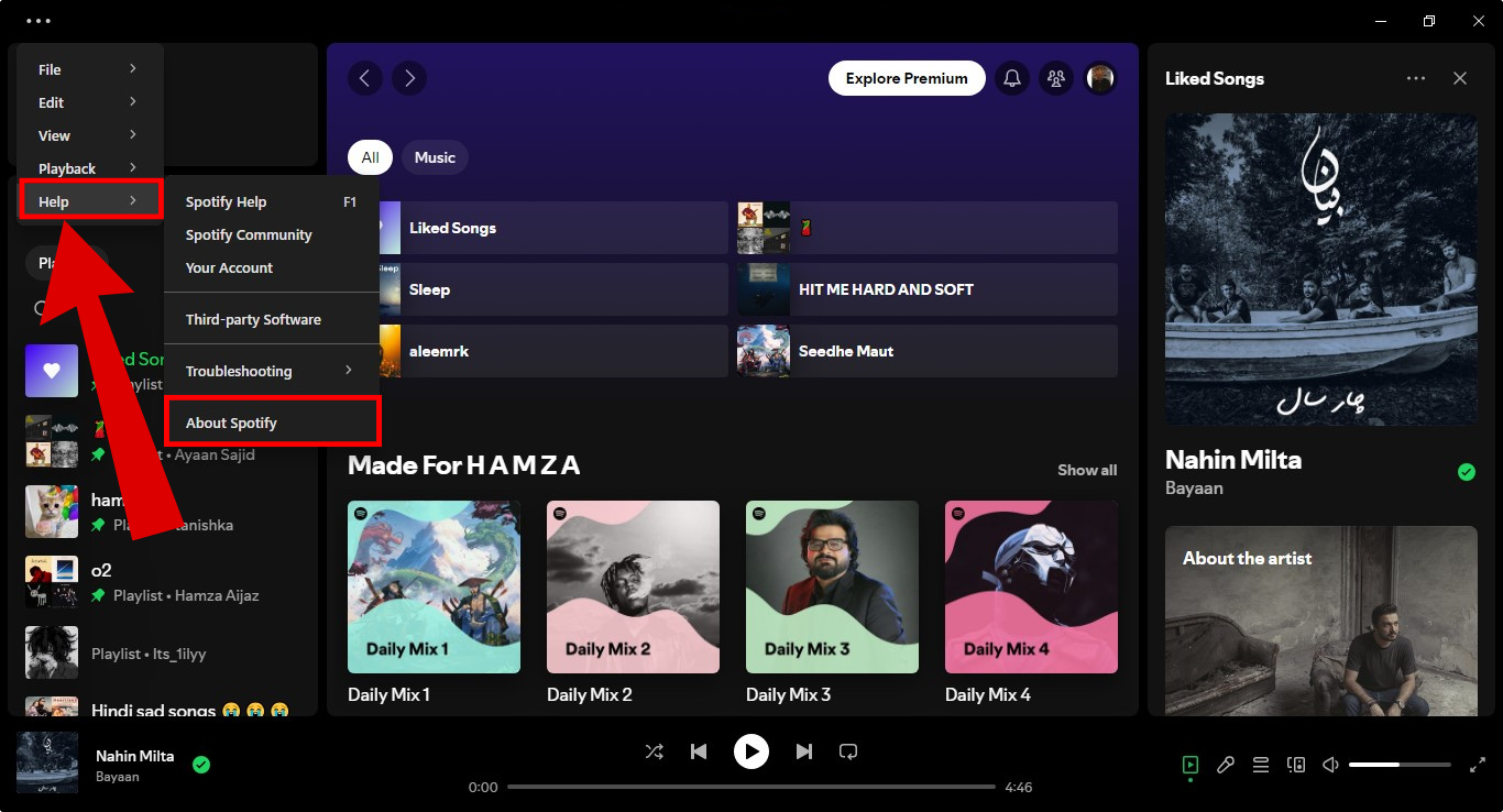 Click on the menu - From the drop-down menu, navigate to Help > About Spotify.