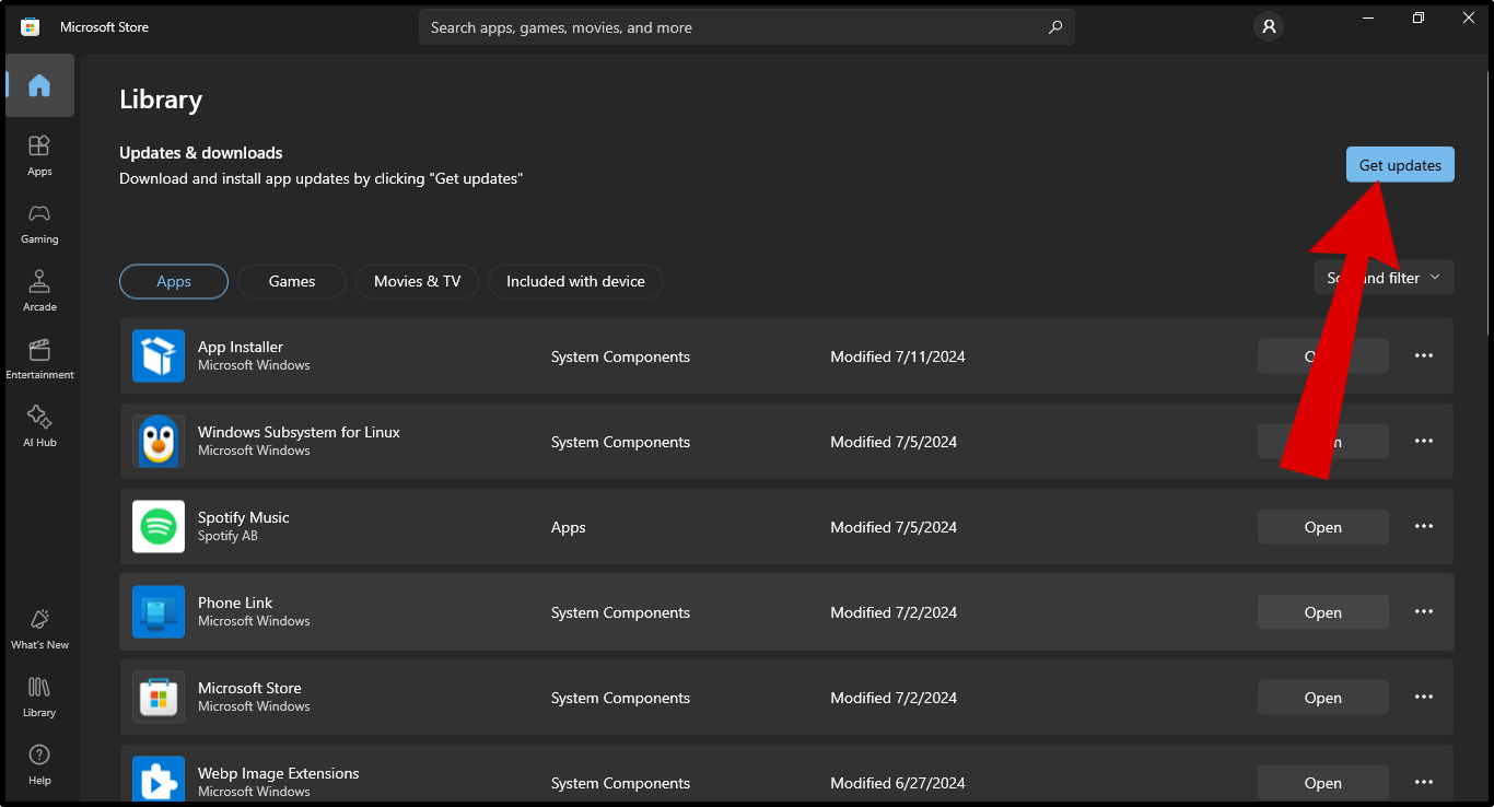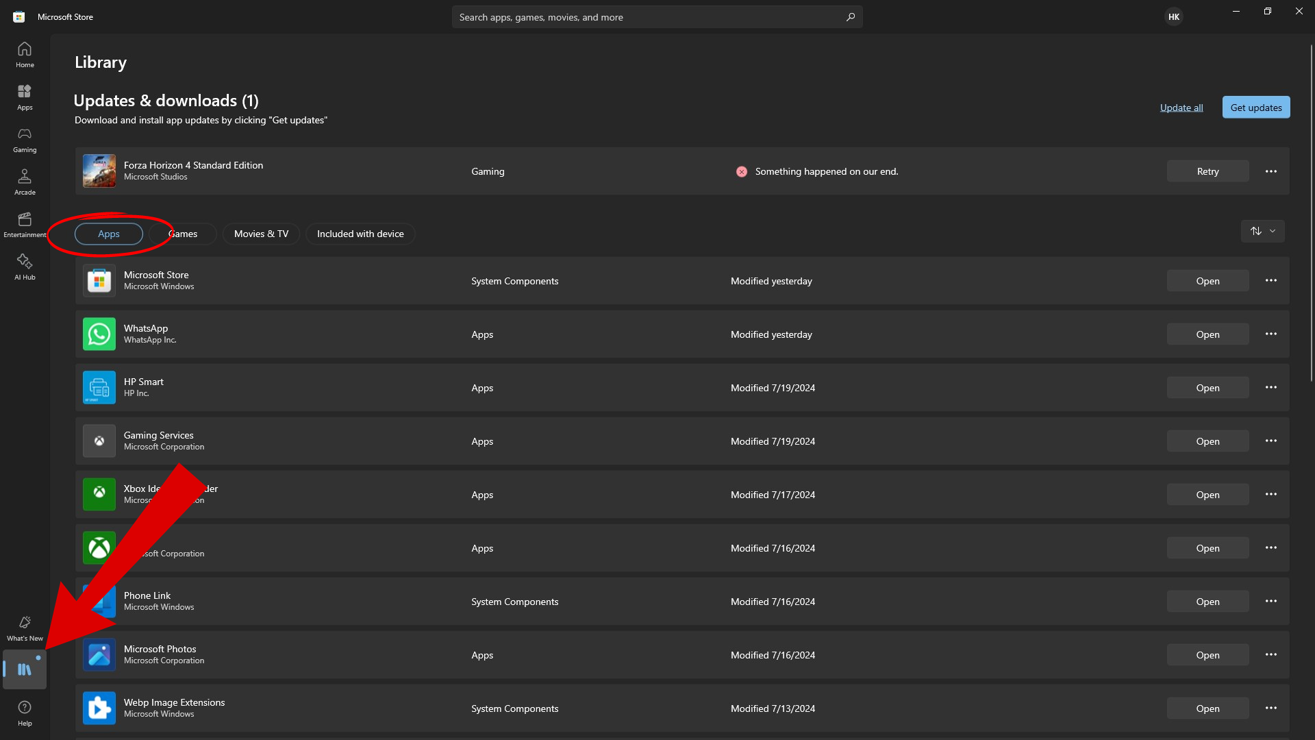 Open Microsoft Store - Next, head to your Library from the bottom-left corner and click on Apps.