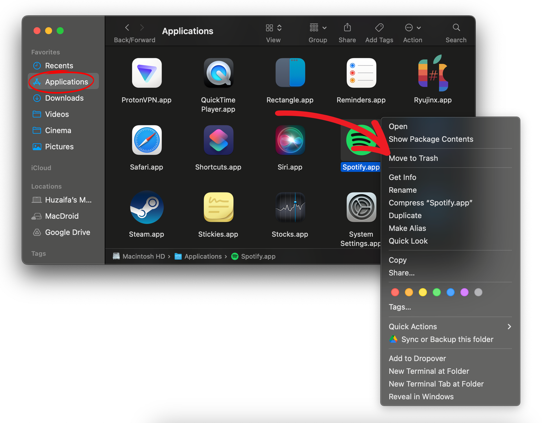 For Mac users, start by opening a Finder window. From there, navigate to “Applications” in the left sidebar. Locate Spotify, right-click on it, and select “Move to Trash“. Afterward, download and install a new copy of Spotify from the official website on your Mac.