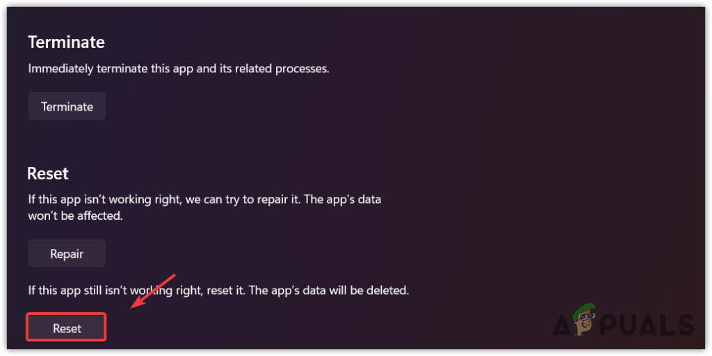 Select Advanced Settings, scroll down to the bottom, and click the Reset button.- Once again, click the Reset button.