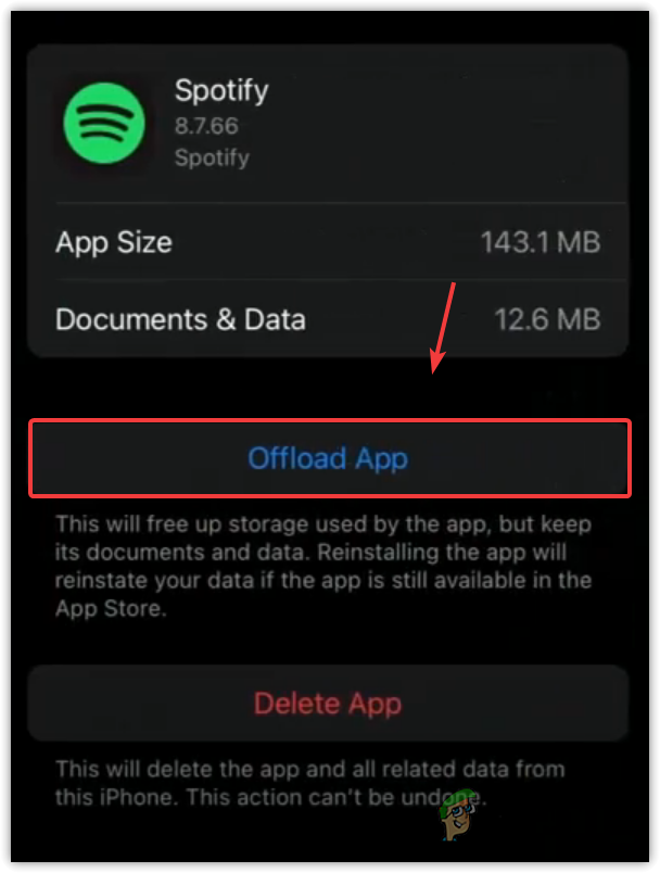 - Once again, tap on Offload App. This will remove all the application data, including Spotify files; hence, you will have to install the Spotify app from the Apps Store.