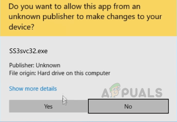 This can be very annoying. It mainly happens because SS3svc.exe is not a trusted service because it might be using old certificates. Old certificates are not verified and are thus flagged by new updates of Windows. You can find below methods to turn this pop up off.