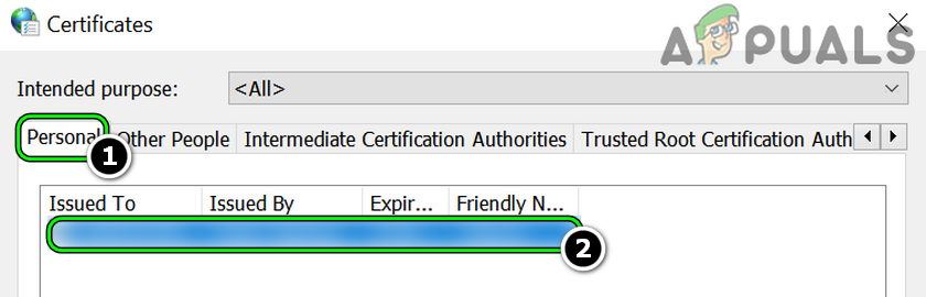 Check the Problematic Certificate in the Personal Tab of the Windows Certificate Manager - Now double-click on the certificate and check if its properties/validity.