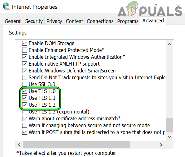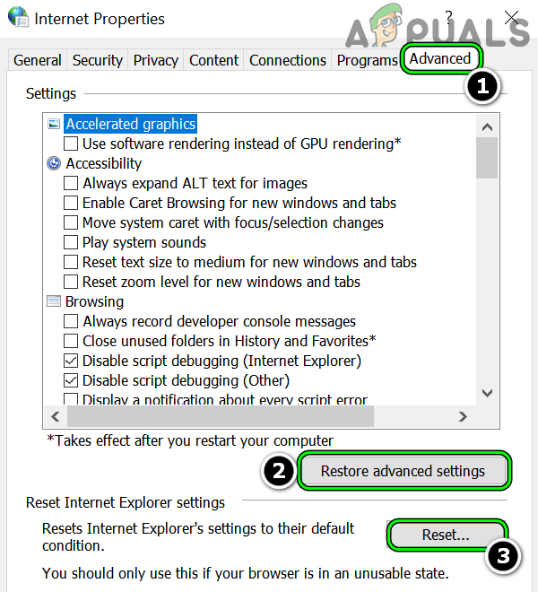 On a Windows machine, the Internet Options cover many of the basic settings used by the OS and applications to access the Internet. A mere misconfiguration of the Internet Options or if its certificate manager is corrupt, then resetting the Internet Options to the defaults may solve the problem.