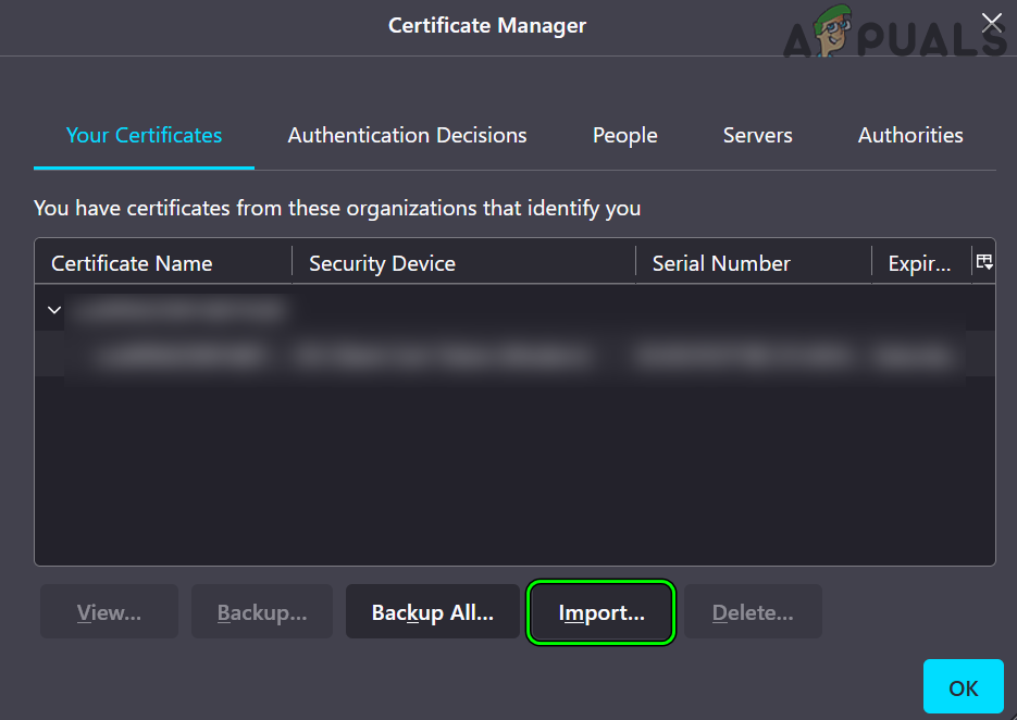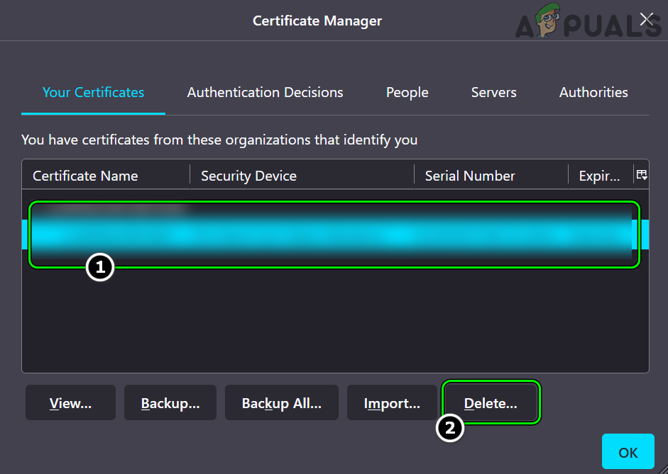 Delete the Problematic Certificate in Firefox - Now click on Delete and then confirm to delete the certificate. Afterward, make sure there is no certificate from the problematic website in the Server’s tab and any relevant CA in the Authorities tab.