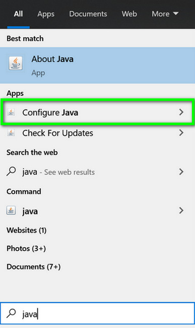 - Click Windows, type, and open Configure Java.