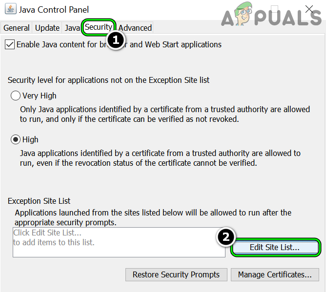 Open Configure Java - Now, head to the Security tab and click on Edit Site List.