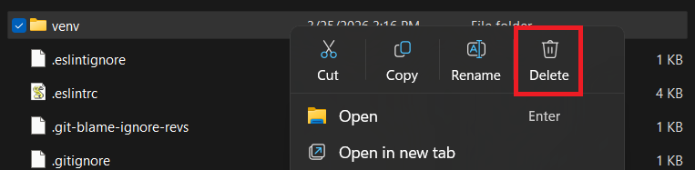 - Delete the venv folder completely.