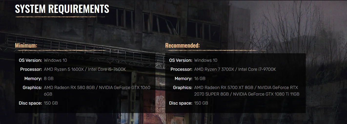 As a consequence of having been announced before the pandemic, the initially released system requirements for S.T.A.L.K.E.R 2 are a bit outdated at this point. However, these specs have remained unchanged on the game’s Steam page for the past 3 years so it’s safe to say, unless the devs have made some huge strides, this is what you can expect on launch day: