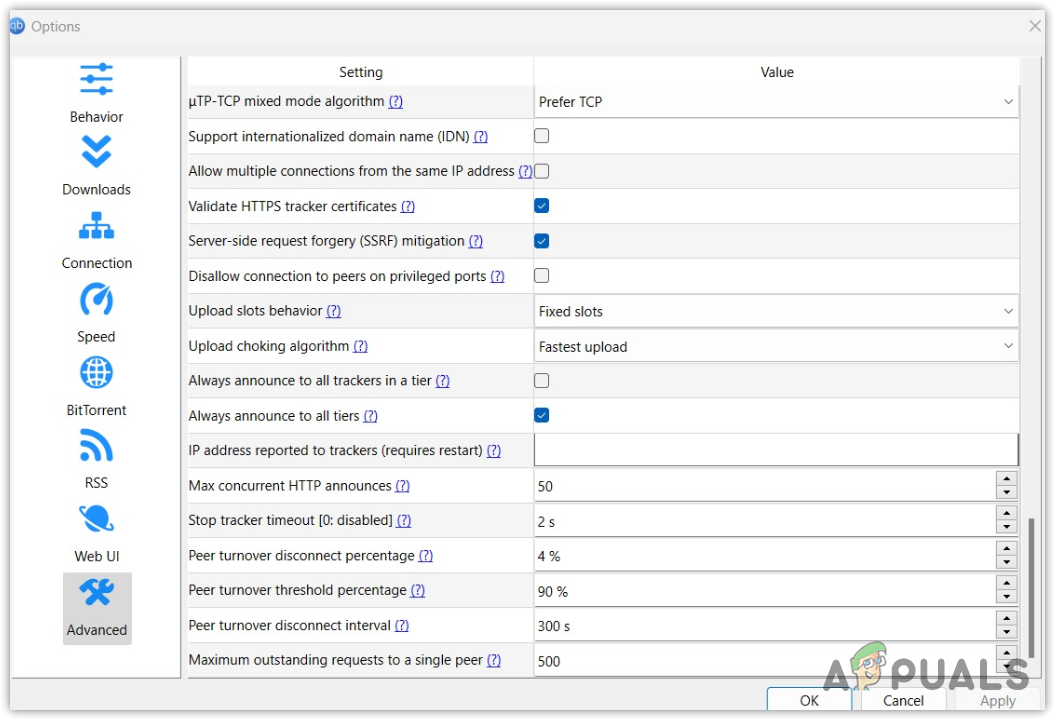 qBittorrent includes numerous settings, making it difficult to pinpoint the cause of the issue. This method provides screenshots of the optimal qBittorrent settings. Ensure your settings match those in the screenshots provided.