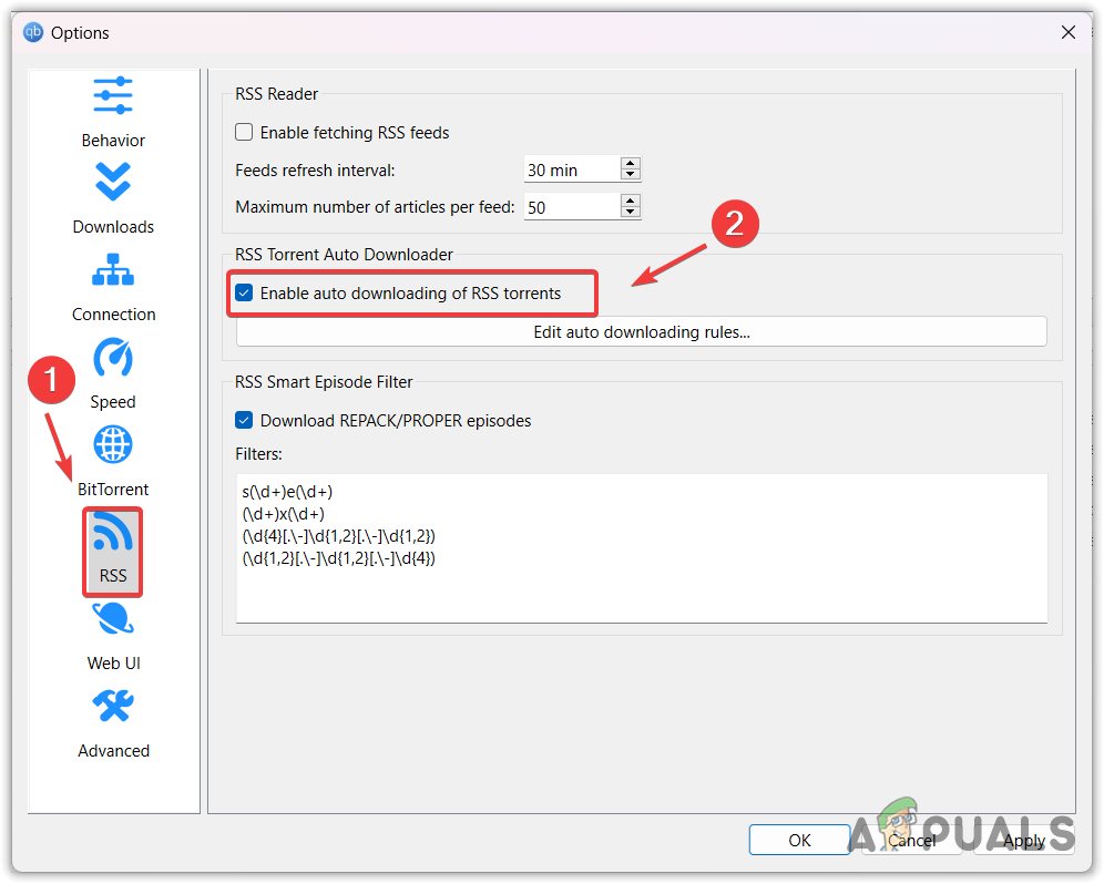 - Ensure that Enable auto-downloading of RSS torrents is selected.