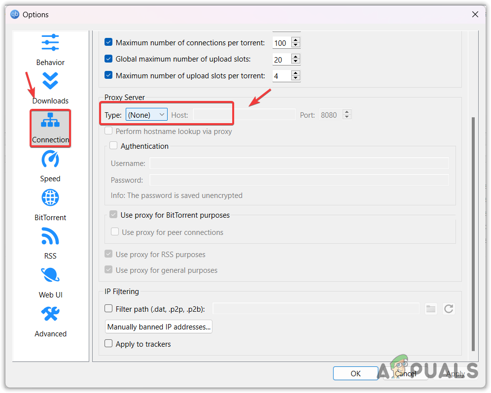 Proxy settings serve as an intermediary between the user and the server. Within qBittorrent settings, a proxy server option is available. Using a proxy server can cause stalled issues in qBittorrent, so it is highly recommended to select None in the proxy settings as detailed below.