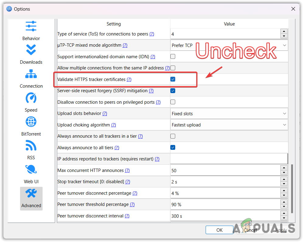 This feature, when enabled, validates HTTPS Trackers and web seeds, helping to establish a secure connection. However, it can also contribute to stalled issues as it adds an extra security layer that complicates downloading via qBittorrent.