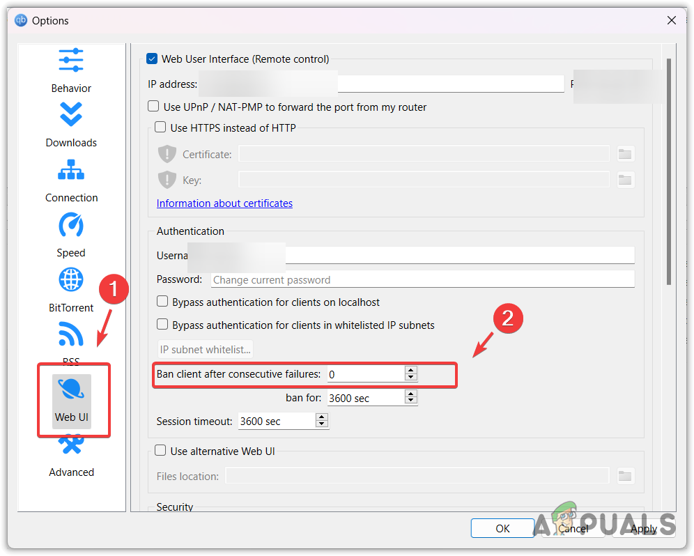 - From the left pane, select Web UI. Here, change the Ban Client after consecutive failures to 0.
