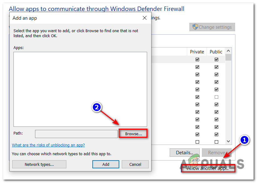 - Finally, inside the list of Allowed apps, make sure that both the Private and Public checkboxes of the two items you added previously are checked.