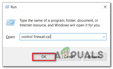 - Press the Windows key + R to open up a Run dialog box. Next, type ‘control firewall.cpl’ and press Enter to open up the Windows Firewall window.