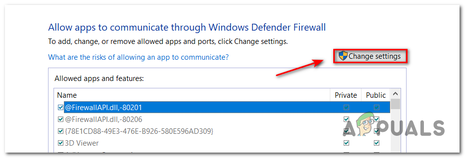 Allowing an app through Windows Firewall - Inside the Allowed apps menu, click on the Change Settings button.