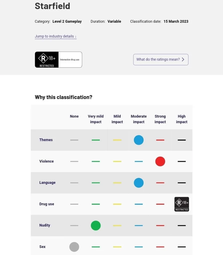 The rating for Starfield said that there was no sex and “very mild” nudity, but it did highlight a “moderate impact” for themes and bad language, as well as a “strong impact” for violence. The game’s drug use category received the highest rating, pushing the game to an R18+ classification.