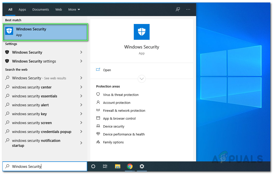 - Press the Windows key to bring out the Windows Menu and then search for Windows Security. Then, in the search results, choose Windows Security.