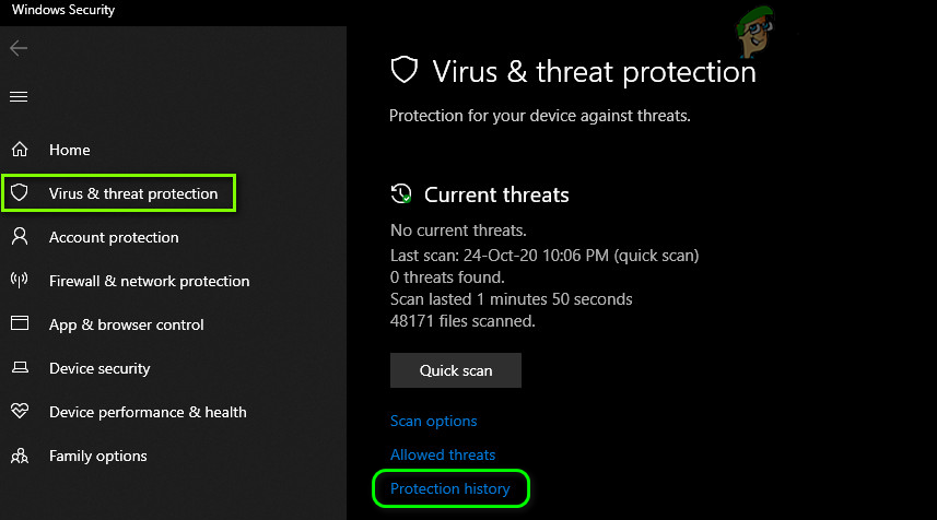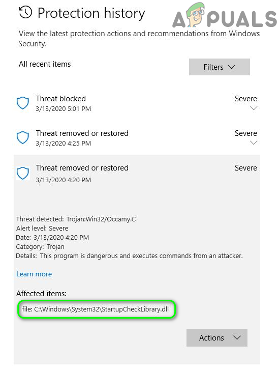 Antivirus/antimalware applications do show false positives where a legitimate file is marked as a threat and thus moved to the quarantine section of the antivirus/antimalware. The same could be the case with the StartUpCheckLibrary.dll. In this context, restoring the said file from the quarantine section of antivirus may solve the problem (only take this step if you are 100% sure that the file is not infected). For elucidation, we will discuss the process for Windows Defender, you may follow the instructions pertinent to your antivirus/antimalware product.