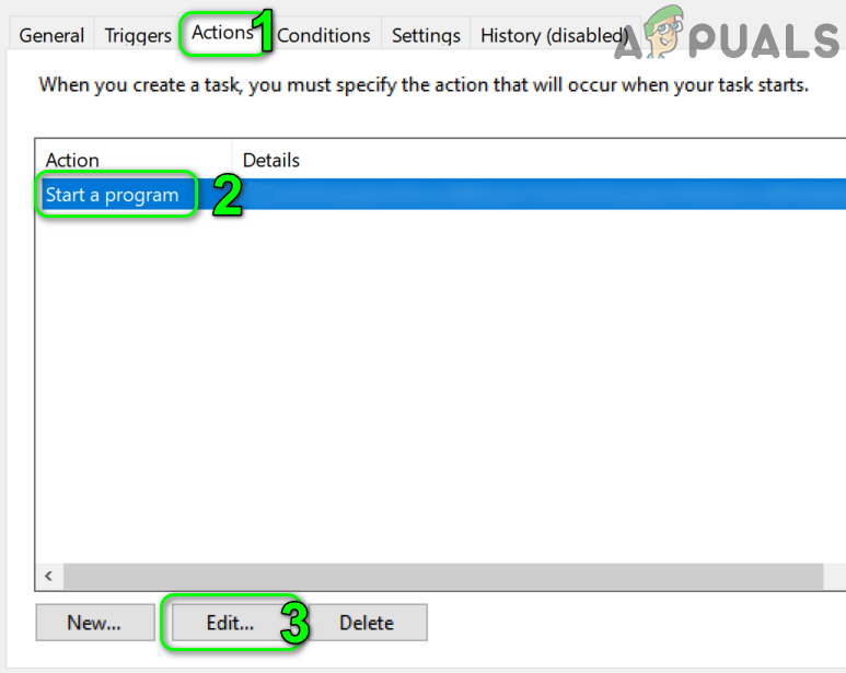 - Then navigate to the Actions tab and select Start a Program and click on the Edit button (near the bottom of the window).