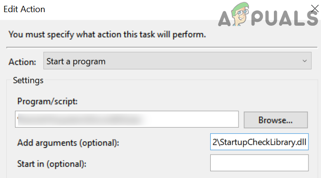 Edit the Properties of StartupCheckLibrary in the Task Scheduler - Now remove the StartupCheckLibrary.dll from the Argument box and click on the OK button.