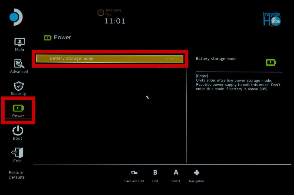 - In the Power menu on the left, select Battery Storage Mode.