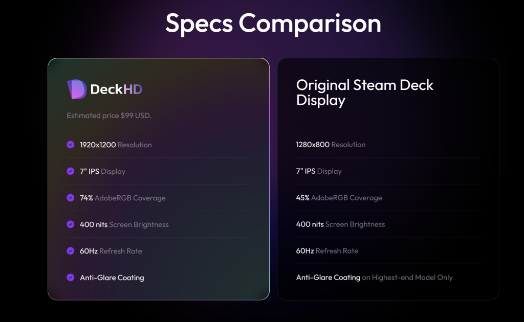 The screen resolution on all three Steam Deck variants is 1280×800, and the premium Steam Deck features an anti-glare covering. What if we switched it out with a high-resolution, anti-glare 1920×1200 display? They intend to do exactly that. In addition, they state that their screen will provide more accurate colors than the original Steam Deck screen (which only covered 45% of the AdobeRGB color space).