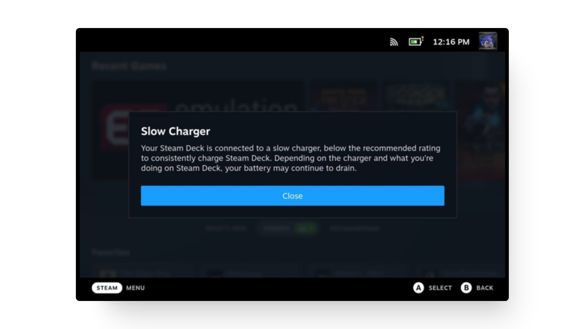 Valve’s included charger has a 45W adapter, and it’s advisable to stick with the same wattage if you’re considering a third-party option. Also, try using another set of cables to eliminate the possibility of a charging issue.
