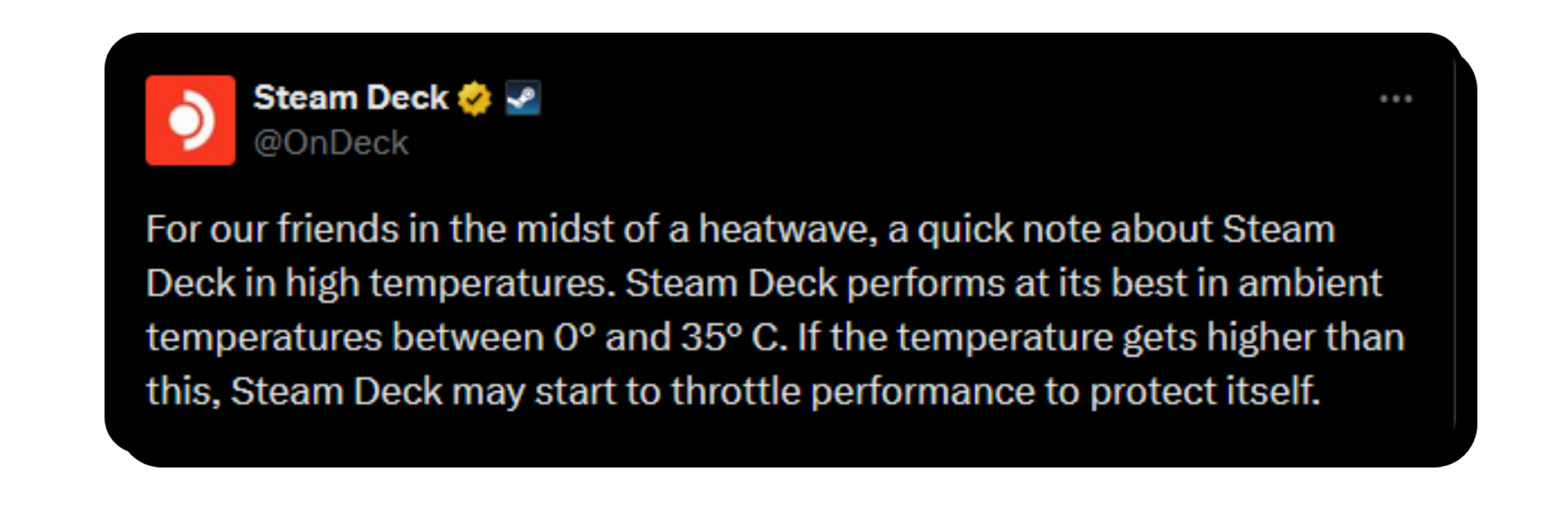 Like other handhelds, a Steam Deck can overheat, especially if you’re playing in a way that blocks the heat vents in the back. Although there’s plenty of thermal headroom, a Steam Deck will automatically shut off if it reaches 105°C.
