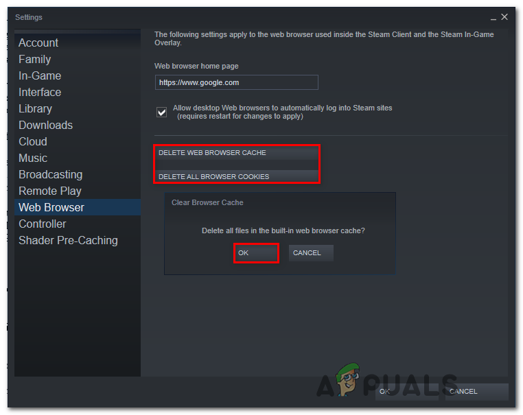 If this scenario is applicable, you should be able to fix the issue by accessing your Steam’s Browser settings and deleting the browser cache in order to clear every bit of temporary data that might be causing this issue.