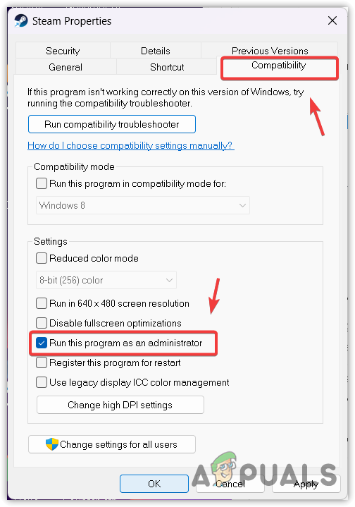 If you have not tried running Steam as an administrator yet, doing so will give privileges to Steam to access the necessary DLL and redistributable files that it requires to run properly. Follow the steps to configure the Steam as an administrator: