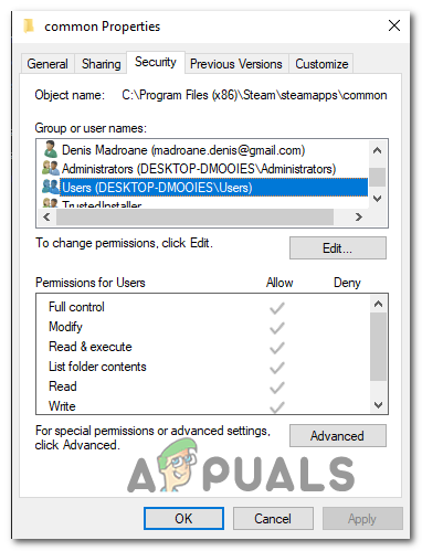 - Users group is missing from the Permission tab of common – It’s been confirmed that this problem can also be caused by insufficient permissions of the common folder (the folder that stores every game file from your Steam library). In this case, you can resolve the problem manually by ensuring that the user group is added to the permission tab.
