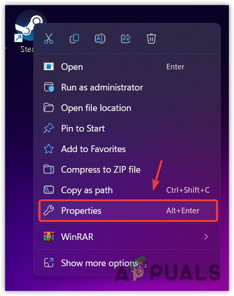 - Right-click on the Steam shortcut and navigate to “Properties.”