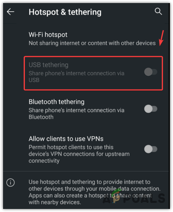 - Turn on the USB Tethering by navigating to the hotspot settings.