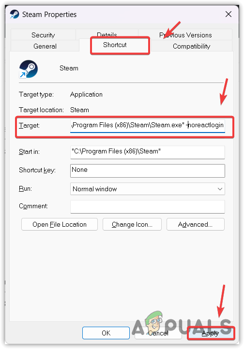 - Add -noreactlogin at the end of the target value.