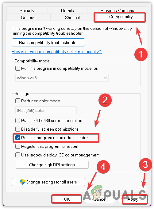 - Under the “Compatibility” tab, check “Run this program as an administrator.”
