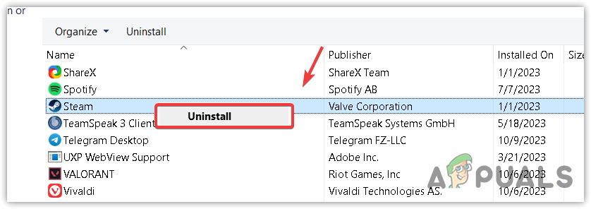- Right-click the Steam and select Uninstall. This will take you to control panel programs & features.