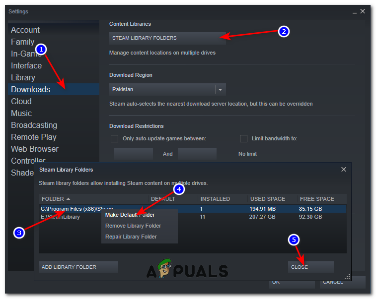 It may be possible that Steam isn’t accepting the file path which is already specified with the Steam installation. We can set a new file path on a different drive and try installing your game there. If the method succeeds, it means there is something wrong with the desired directory where you were trying to install your game.