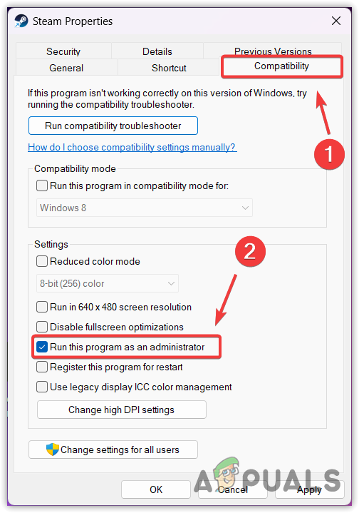 - Go to Compatibility and tick Run this program as an administrator.