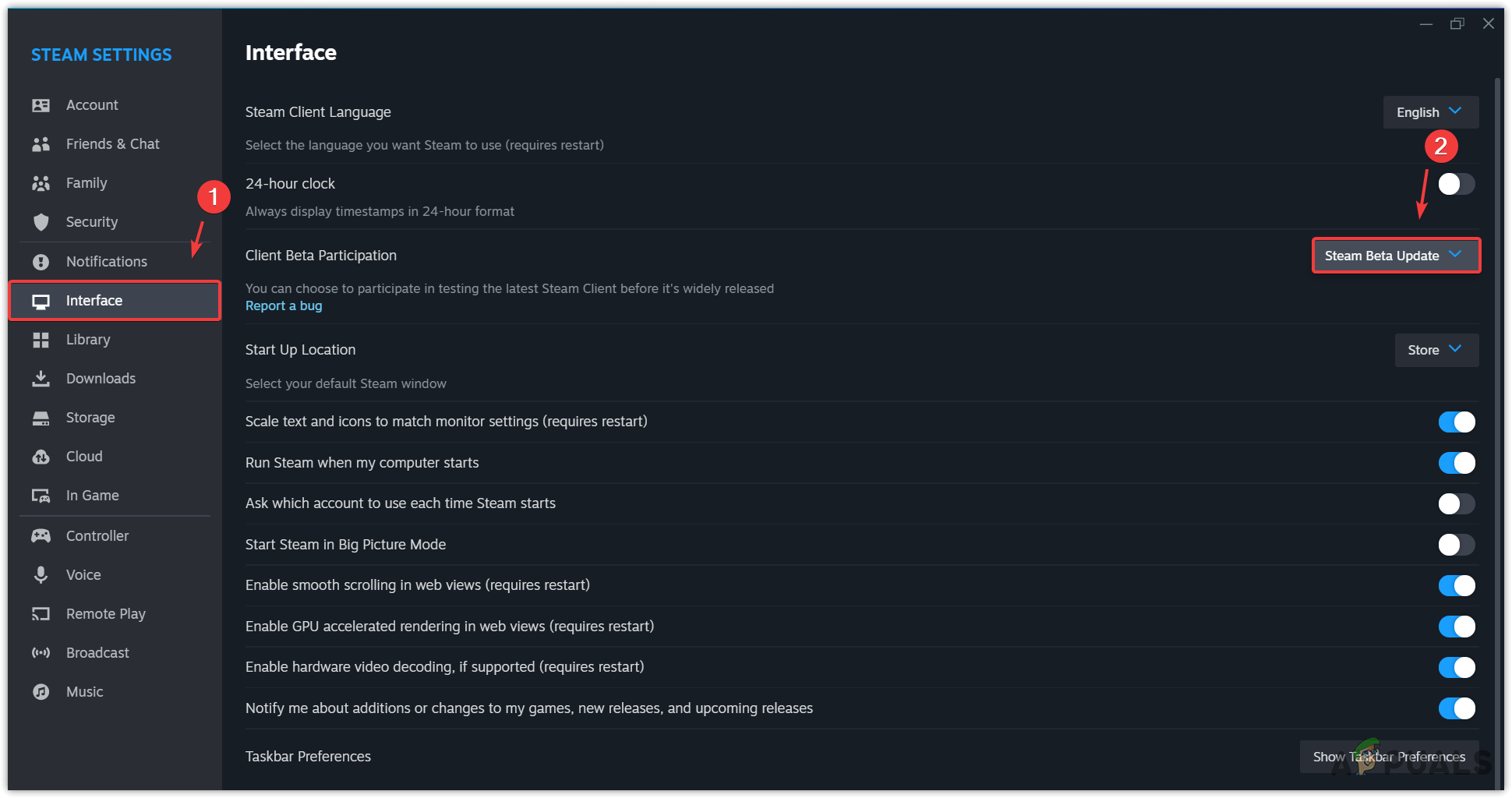 - Select the Steam Beta Update from the dropdown of Client Beta Participation.