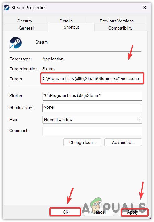 This error often occurs due to a problem with the cache files, we can try launching Steam with no cache. To configure Steam to launch with no cache, you will have to add a launch parameter, which will execute before Steam loads the configuration files.