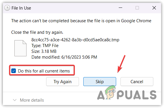 - If you encounter the error message, This action can’t be completed because the file is open in <name> application, tick Do this for all current items and click Skip.