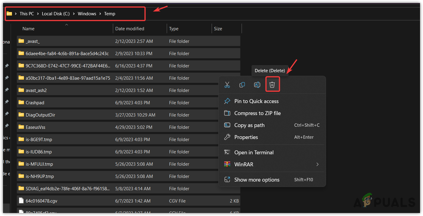 - Select all the files by pressing Ctrl + A and use the delete key to remove the temporary files.