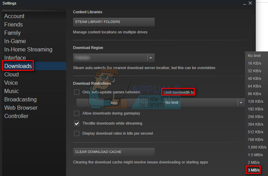 There can be another conflict between your internet connection and your disk write speed. Your internet connection might be too fast while disk write speeds always have their limitations. We can try reducing your bandwidth to something acceptable and restarting Steam.