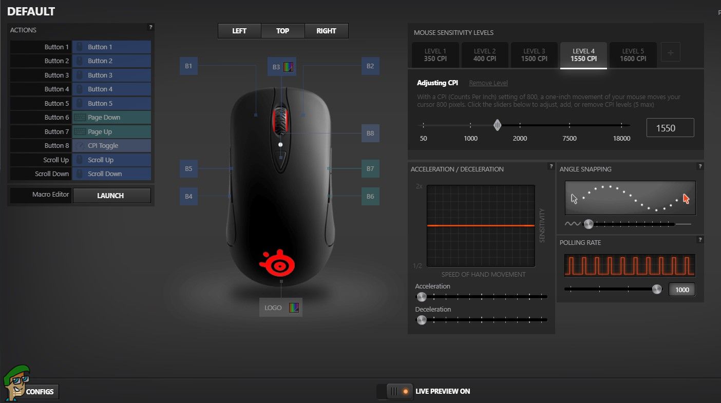 Once you press the CPI button, it will blink and correspond to the profile number. Other than that, the software has acceleration and deceleration. We also have the usual options to control the angle snapping and polling rate.