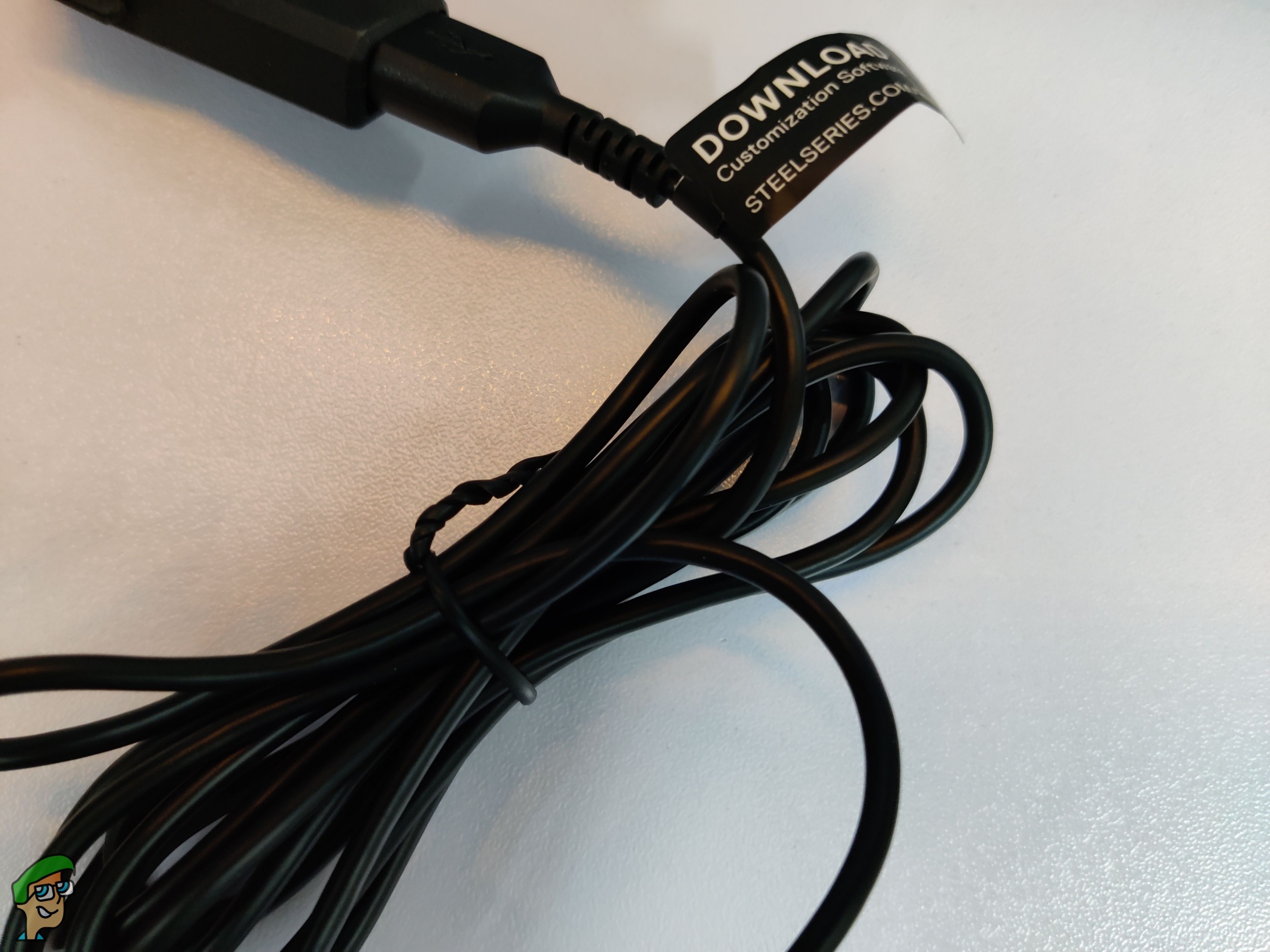 As for the cable, it’s not braided, but it uses a very light rubber coating. The length is about 2 meters, and it works great with a bungee. Lastly, the tip of the cable has a SteelSeries logo, if you need to find the cable behind your PC.
